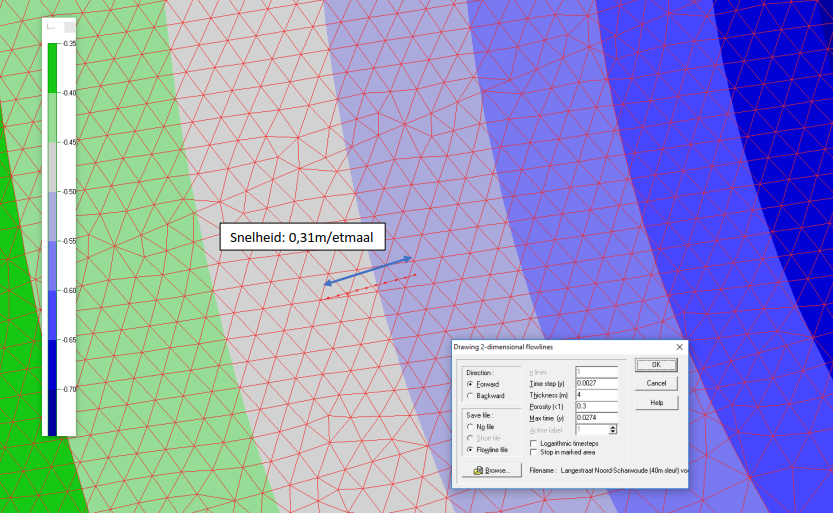 Using the finite element program MicroFEM, a non-stationary dewatering calculation has been made in which over time (over a period of a few days) it is possible to look at, among other things, the required extraction flow rates, the reduction in the groundwater level and the displacement of the contamination. A temporary sheet pile wall construction prevents the influx of water from the adjacent waterway and limits the movement of the contamination. As soon as drainage is carried out for the connecting sewerage, a screen will be created between the drainage and the contamination by means of return sources. This ensures that there will be no groundwater flow from the contamination towards the pumping station.