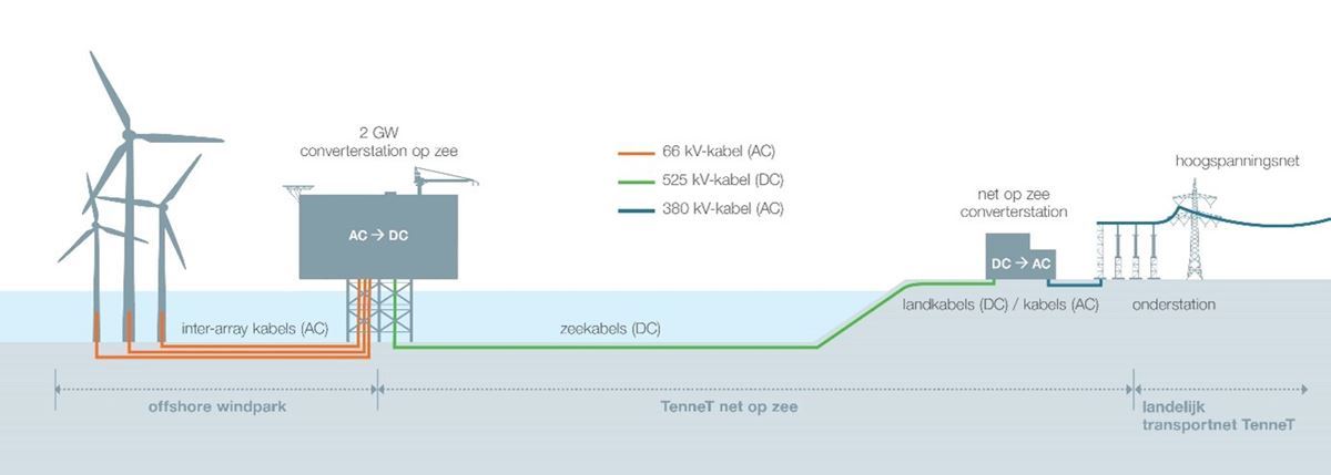 Electricity from offshore wind turbines will converge on newly built offshore platforms (stations) with a capacity of 2GW per platform at sea. Underground (DC) high voltage connections of 525kV are required to transport the power to land. The underground high-voltage connections will run from the offshore platform through the North Sea and then come ashore at the yet-to-be-built onshore stations. The 2GW IJmuiden Ver Alpha and Nederwiek land stations will be built in Borssele.