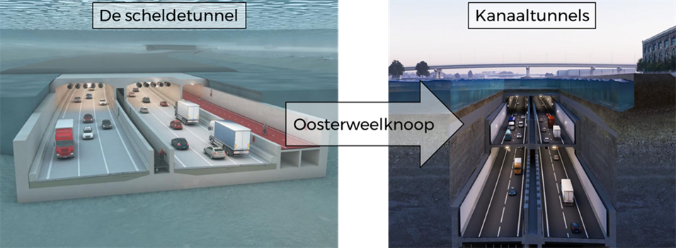 De Oosterweelknoop vormt de verbinding tussen de Scheldetunnel en de Kanaaltunnel. Daar waar de Scheldetunnel een brede tunnel betreft met 6 rijstroken naast elkaar, bestaat de Kanaaltunnel daarentegen uit 4 gestapelde tunnelbuizen. Om de verbinding te kunnen realiseren weven verschillende tunnelkokers op, over en langs elkaar heen binnen de Oosterweelknoop.